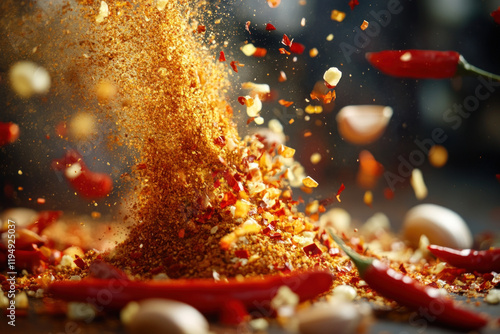 A pile of spices with vibrant red peppers and assorted seasonings.