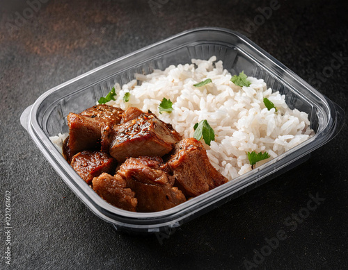 A plastic takeout container is filled with glazed teriyaki meat pieces and steamed white rice garnished with fresh parsley.