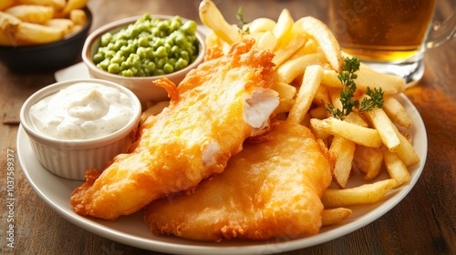A plate of crispy fish and chips with golden battered fish fillets and thick-cut fries, served with a side of tartar sauce and lemon wedges, Fish and chips centered