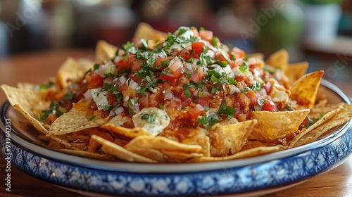 A plate of nachos featuring diced tomatoes, onions, and cilantro, artistically arranged on a decorative blue-and-white plate
