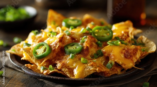 A plate of nachos is loaded with melted cheese spicy jalapenos and fresh green onions capturing a cozy atmosphere perfect for sharing or solo enjoyment.