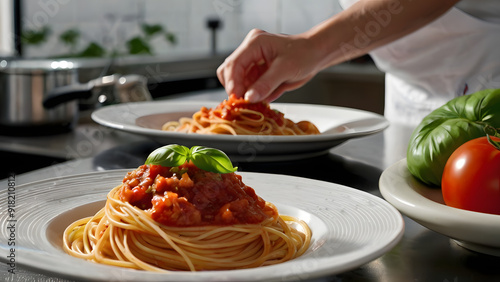 A plate of spaghetti with red sauce and basil leaves. A chef is reaching for the noodles. The plate is on a counter in a kitchen