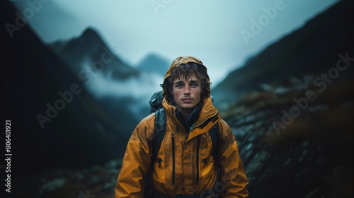A portrait of a young Caucasian man with a mountain jacket and backpack, at high altitude, amid misty mountains, vegetation, fog, drizzle