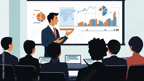 A professional conference room, a man presenting economic data to a diverse group of attendees. The audience focused intently on a screen displaying detailed charts, statistics. cartoon illustration