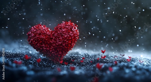 A red heart made of red rose petals lying on the ground looks very attractive. And it is surrounded by leaves and snow. An idea to create a romantic atmosphere for Valentine's Day.