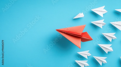 A red paper plane diverging from a group of white planes on a blue background, symbolizing the concept of thinking outside the box and innovation.