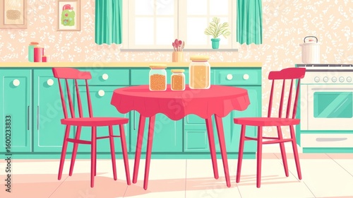 A retro-style kitchen scene with a round table and chairs.