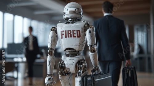 A robot with a fired sign on its back walking in an office