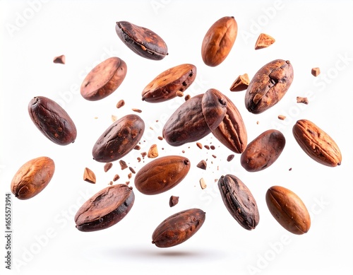 A scattering of raw cocoa beans on a white surface.