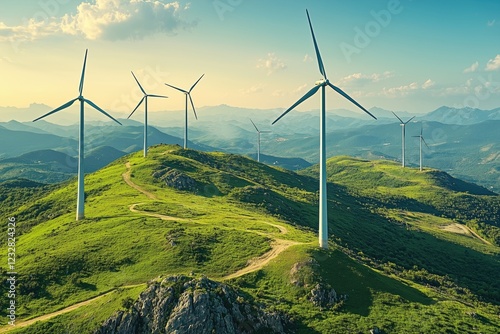 A scenic view of wind turbines on rolling green hills under a clear blue sky, symbolizing renewable energy and environmental sustainability.