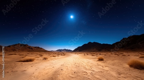 A serene desert landscape illuminated by moonlight, highlighting the beauty of nature and the tranquility offered by starry nights in an expansive, open environment.