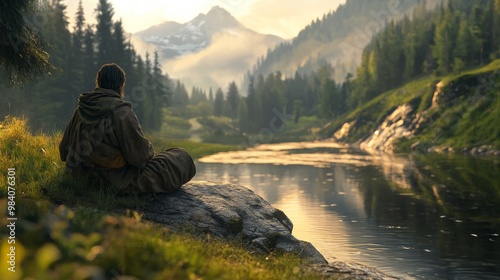 A serene figure sits by a tranquil river, surrounded by lush greenery and majestic mountains under a soft, golden light.