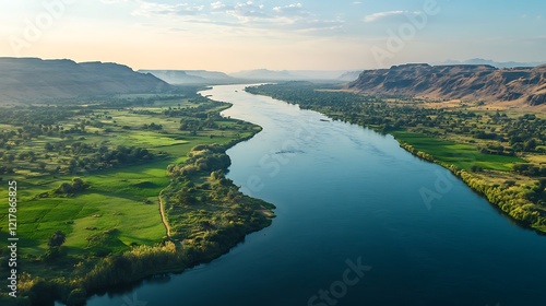 A serene river winding through lush green landscapes under a clear sky.