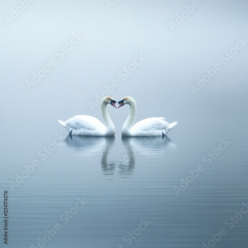 A serene scene featuring two swans forming a heart shape with their necks on calm waters, enveloped in mist, This image is ideal for themes of love, nature, weddings, or tranquility,