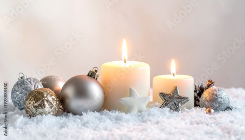 A serene winter scene with lit candles and Christmas ornaments (1)