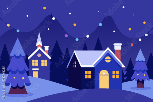 A serene winter village scene with houses nestled under a snowy night sky, illuminated by warm holiday cheer and festive decorations