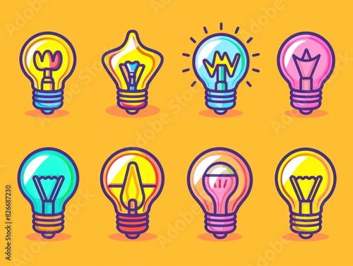 A set of eight light bulbs with different shapes and colors. The bulbs are arranged in a row, with some of them being brighter than others. Scene is cheerful and playful, as the different shapes