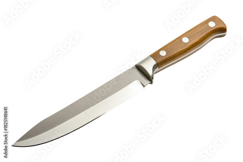 A sharp kitchen knife with a wooden handle. resting on a clean white background. its elegant design and functionality. ideal for culinary use and food preparation