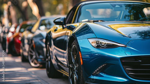 A shiny blue sports car parked in an outdoor lot, surrounded by other used vehicles, with a dealer agent explaining its features to a potential buyer.
