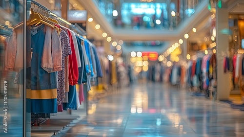 A shopping mall clothing store displays various apparel on hangers.