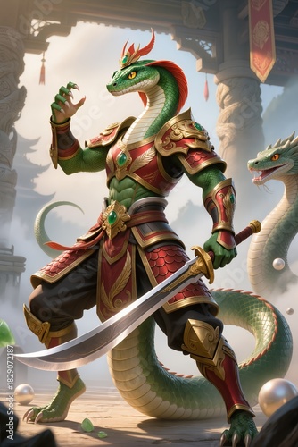 A sleek anthropomorphic snake warrior wearing serpent-themed red-and-gold armor, ornate scales and metallic engravings, poised in a striking battle stance, high-detail Chinese mythic fantasy style