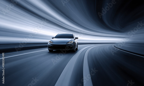 A sleek vehicle gracefully navigates a tunnel with a dynamic blurred effect, showcasing speed and modern design.