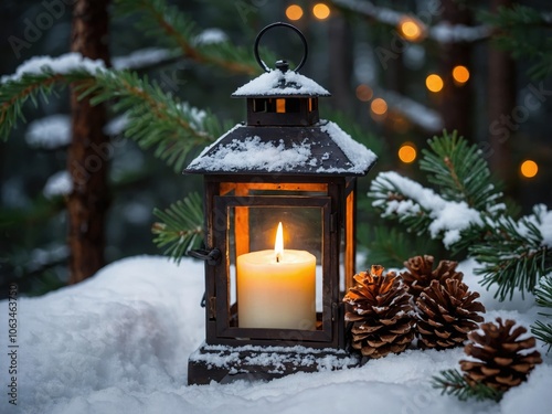 A small rustic lantern with a glowing candle inside, casting a warm light and creating a cozy atmosphere, perfect for outdoor gatherings or holiday decor