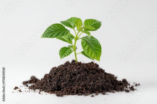 A small, vibrant plant sprouts from a mound of dark soil, against a plain white background