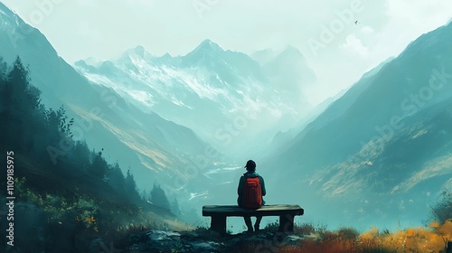 A solo traveler sitting on a rustic bench overlooking a serene mountain valley, with a backpack at their side, distant peaks covered in mist