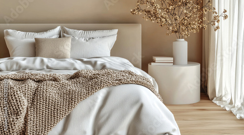 A spacious and serene bedroom with a neutral color palette of beige, soft white, and light gray. The design is minimalist, featuring a neatly made bed with cozy, textured bedding. Soft.