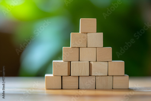 A stack of building blocks forms a house shape on a wooden surface with a blurred green background creating a warm, inviting atmosphere