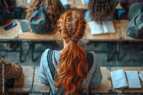A student with intricately braided red hair is concentrating on her studies in a classroom setting