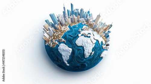 A stunning 3D globe showcasing a vibrant urban landscape surrounded by rich blue oceans, symbolizing harmony.