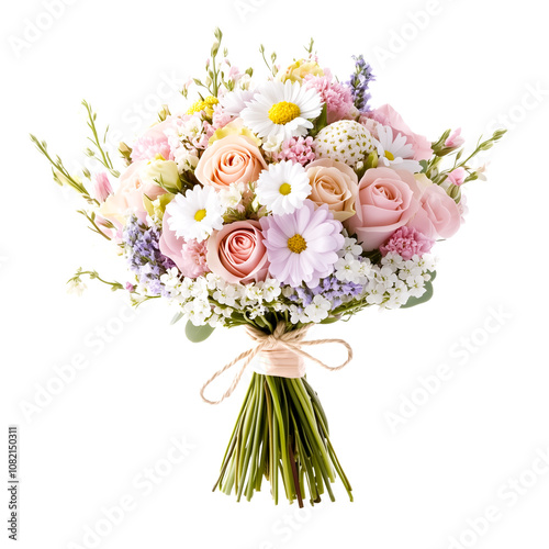 A stunning bouquet made of pink roses, white daisies, and purple flowers tied with twine, perfect for gifting