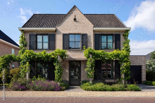 A stunning brick house, charmingly draped in lush green vines and vibrant flowers, basks in the warm sunlight of a serene, peaceful neighborhood
