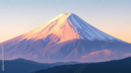 A stunning view of a snow-capped mountain peak illuminated by the soft hues of sunrise