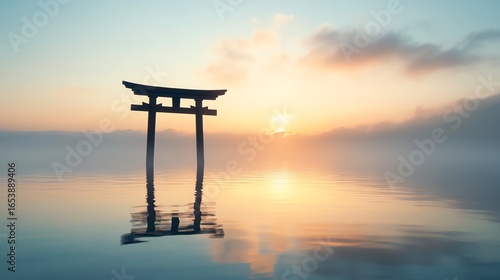 A stunning wooden torii gate rises from calm waters at sunrise, creating soft reflections that enhance the tranquil scenery.