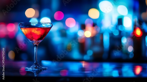 A stylish cocktail glass placed on the left, softly blurred vibrant nightclub