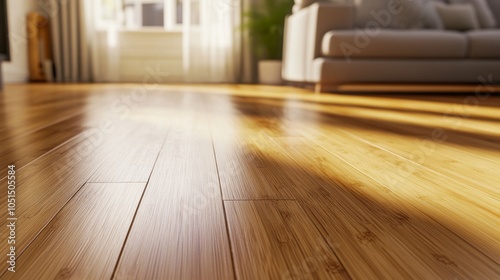 A stylish living room with warm-toned bamboo flooring, offering a sustainable touch. Close-up detail shows the surface, with ample copy space on the left.