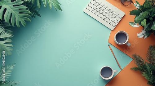 A stylish workspace featuring a keyboard, two coffee mugs, a pen, and lush greenery against a colorful backdrop.