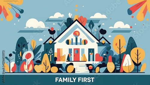 A stylized family home nestled amongst vibrant foliage