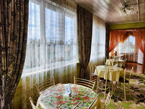 A table in a small cozy cafe or restaurant with a window and curtains. Dimmed lights, beautiful Design of the hall. Nobody to a place to relax and eat
