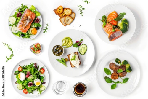 A table with a variety of healthy food options, including salads, sandwiches, and fish. The table is set with white plates and bowls, and there are several cups and a bottle on the table