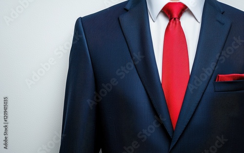 A tailored navy blue suit with a red tie, showcased on a clean white background with soft shadows