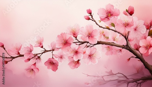 A thin, graceful branch with a few delicate pink cherry blossoms painted in watercolor.