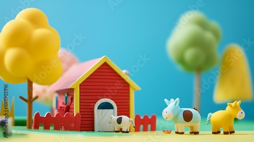 A toy farm with a barn and animals on a blue and yellow background