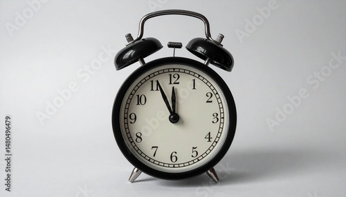 A traditional analog alarm clock on a nightstand facing the camera, softly lit, with a peaceful background of a person still sleeping in bed, capturing a serene early morning bedroom scene