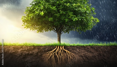 A tree thrives under a dramatic sky, its roots reaching deep into the earth
