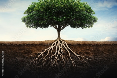 A tree with roots is visible from above and below the ground. It represents growth, stability, and connection to the earth.