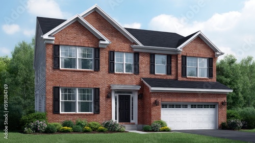 A two story red brick home with black shutters a white garage door and a manicured lawn under a cloudy sky